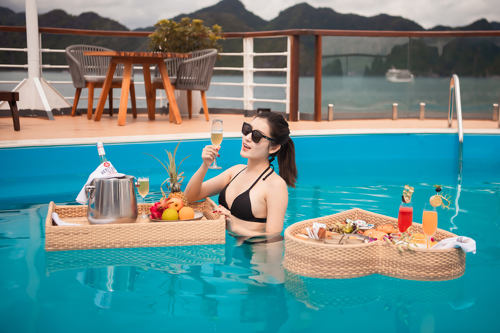 Bể bơi nằm trên khoang tàu và lại lênh đênh giữa mặt biển, nước bao trùm lấy nước là một khung cảnh rất thú vị mà không phải ở đâu bạn cũng cơ hội được trải nghiệm.