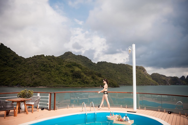 Đáng chú ý nhất chính là bể bơi nằm ngay trên khoang tàu - nơi tạo ra những tấm ảnh bikini sexy vô cùng ấn tượng của Huyền My.